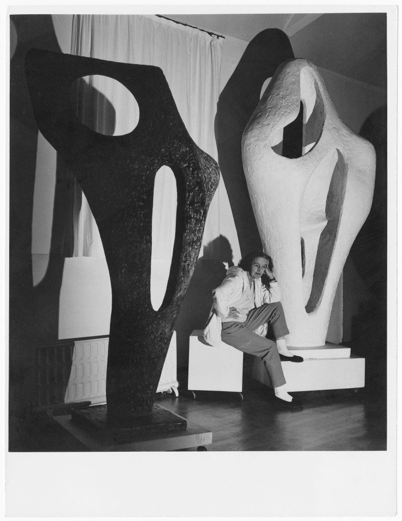 Credit: Barbara Hepworth with Figure for Landscape and a bronze cast of Figure (Archaean) November 1964. Photo Lucien Myers © Bowness