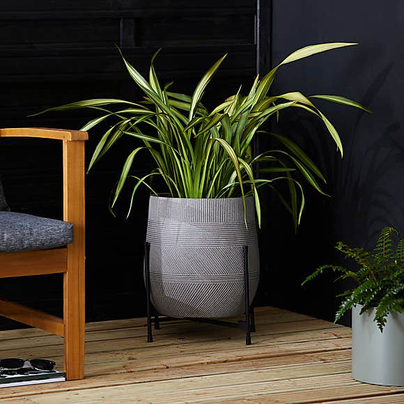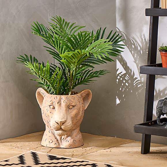 Fibre Clay Grey Plant Pot with Metal Stand, £25 | Resin Leopard Head Planter, £18 | Gold Monkey Planter, £18, all Dunelm