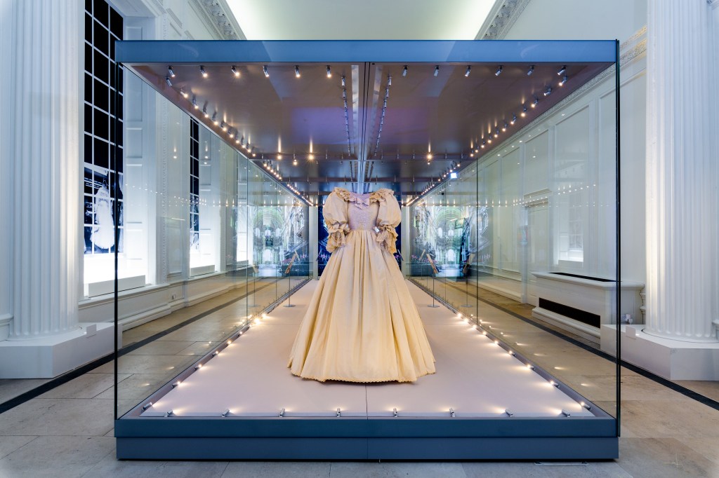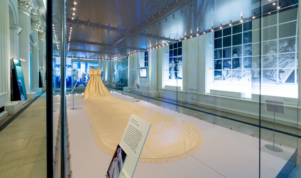 The dress, on loan from Princes William and Harry, is displayed complete with its 25 feet sequin encrusted train, the longest in Royal history.