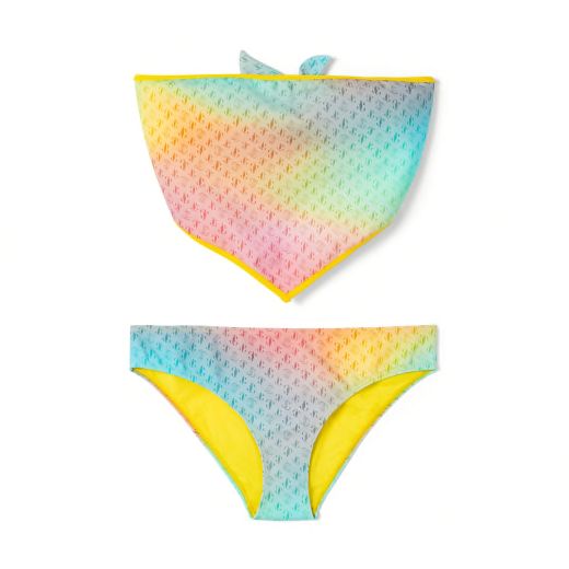 The collection is a tight edit of pastel, ice cream hued pieces, with a tie dye finish. Several of the items feature the brand’s JC logo emblem, with this kind of print detailing remaining a key trend. There are two branded swimsuits and a couple of bikinis that feature two different tops and two styles of bikini briefs, sold separately, that can be mixed and matched. Each piece in the collection is named, although thoroughly interchangeable. Available up to a size 16, bikini separates start from £175, with swimsuits priced at £375.