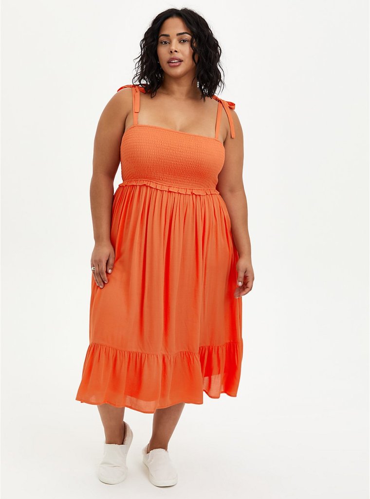 SMOCKED TIERED MIDI DRESS – TEXTURED RAYON ORANGE, $69.50, Torrid