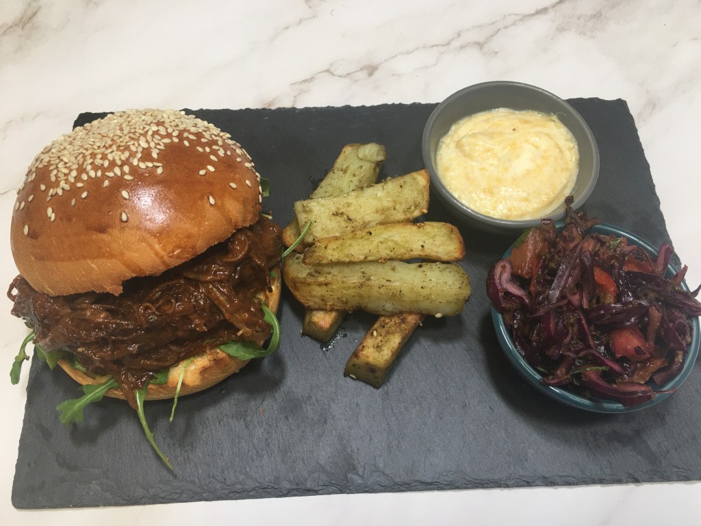 To serve, we’ve opted for some chips, slaw and a garlic mayo dip, but it’s a fairly filling dish just on its own. Of course if you think a burger bun might not be substantial enough, try this a pulled bbq brisket sandwich, served in a toasted ciabatta for an equally delicious dinner.