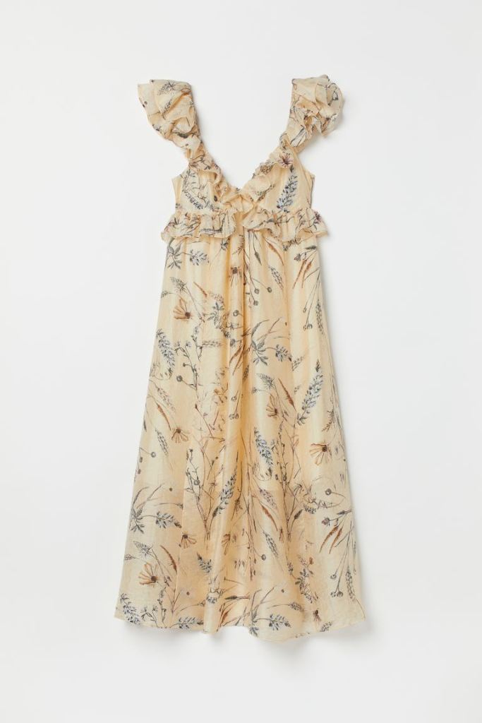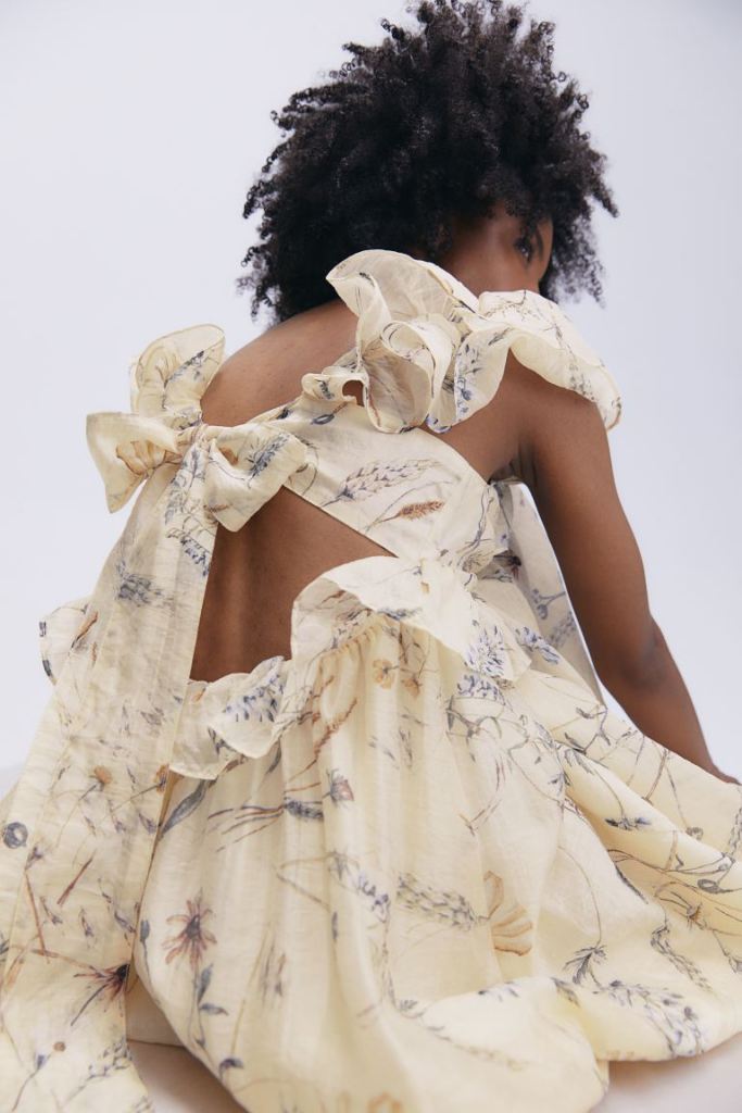 We love this sunny yellow flounce detail dress from H&M, £24.99. Unashamedly girly, the loose cut is not only flattering but perfect for keeping you cool in this heat and we love the flouncy shoulders and bow detail along the back which provides enough coverage to hide the back of your bra too. Just add sandals and sunscreen.
