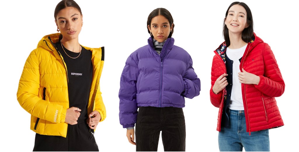 Left: Yellow jacket, £79.99, SuperDry; Middle: Purple cropped puffer, £55, Weekday; Right: Red padded jacket, £59.95, Joules