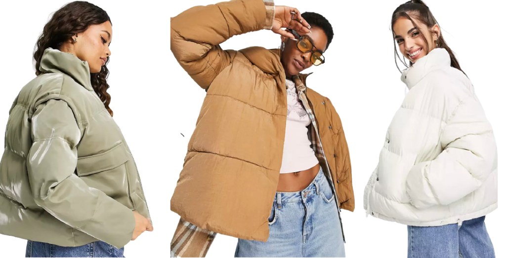 Left: Khaki sheen jacket, £60, Topshop Petite; Middle: Camel padded jacket, £60, Only at ASOS; Right: White padded jacket, £45, ASOS Design