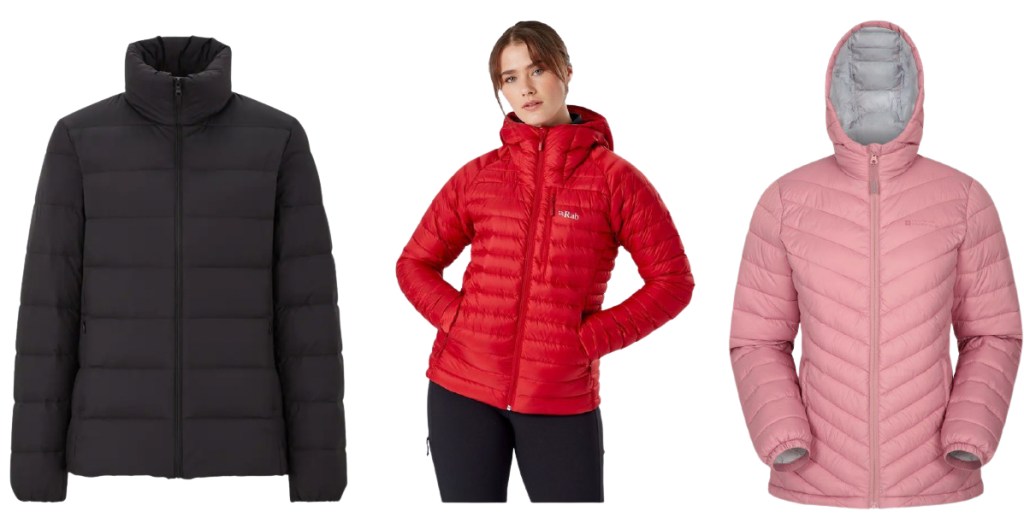 Left: Black padded jacket, £59.90, Uniqlo; Middle: Red jacket, £200, Rab at Snow + Rock; Right: Pink quilted jacket, £34.99, Mountain Warehouse