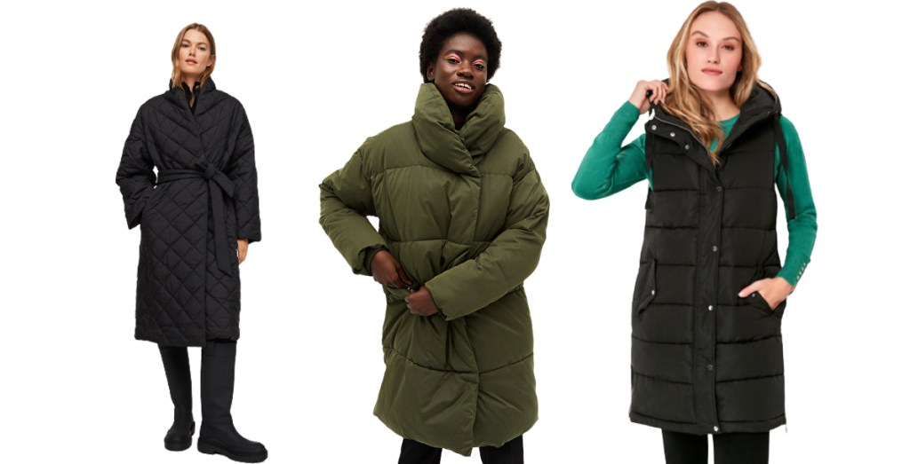 Left: Women’s long black puffer coat, £89.99, Mango; Middle: Long green puffer coat, £65, Monki; Right: Black sleeveless gilet coat, £49.99, M&Co
