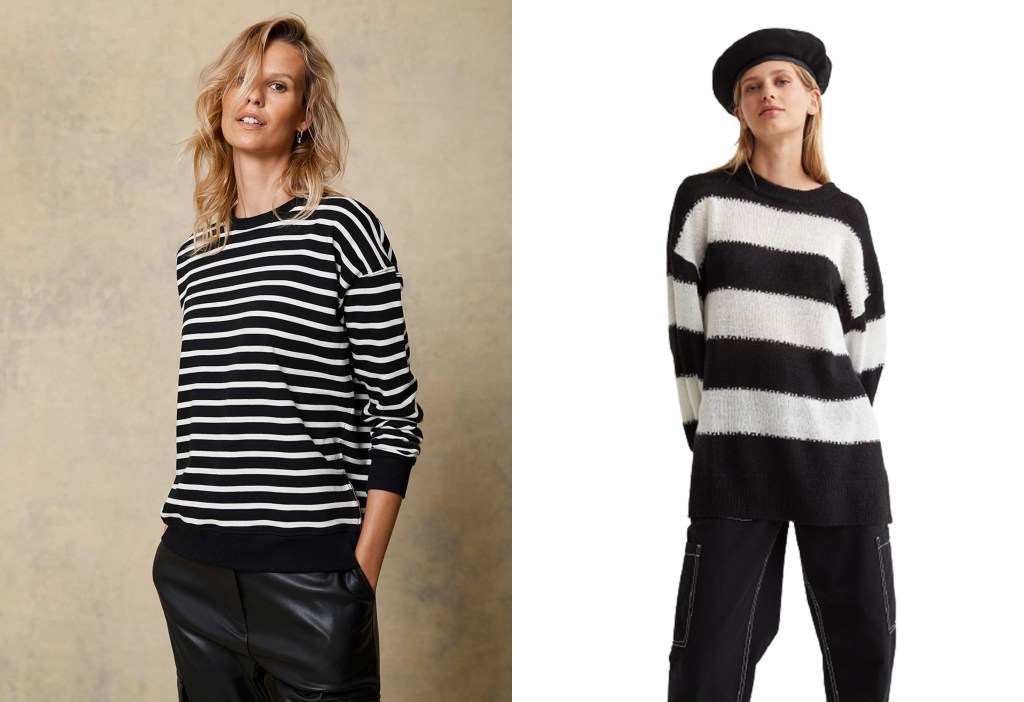 Left: Striped sweatshirt, £69, Mint Velvet; Right: Wide stripe jumper, £19.99, H&M