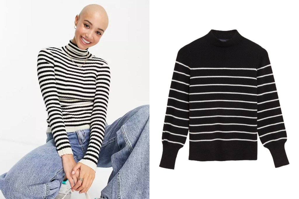 Left: Striped roll neck jumper, £24, Pieces at ASOS; Right: Black striped funnel neck jumper, £25, Marks & Spencer