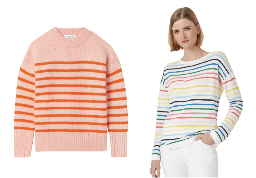 Left: Pink and orange striped jumper, £275, La Ligne at Net-A-Porter; Right: Rainbow stripe jumper, now £49, Hobbs London