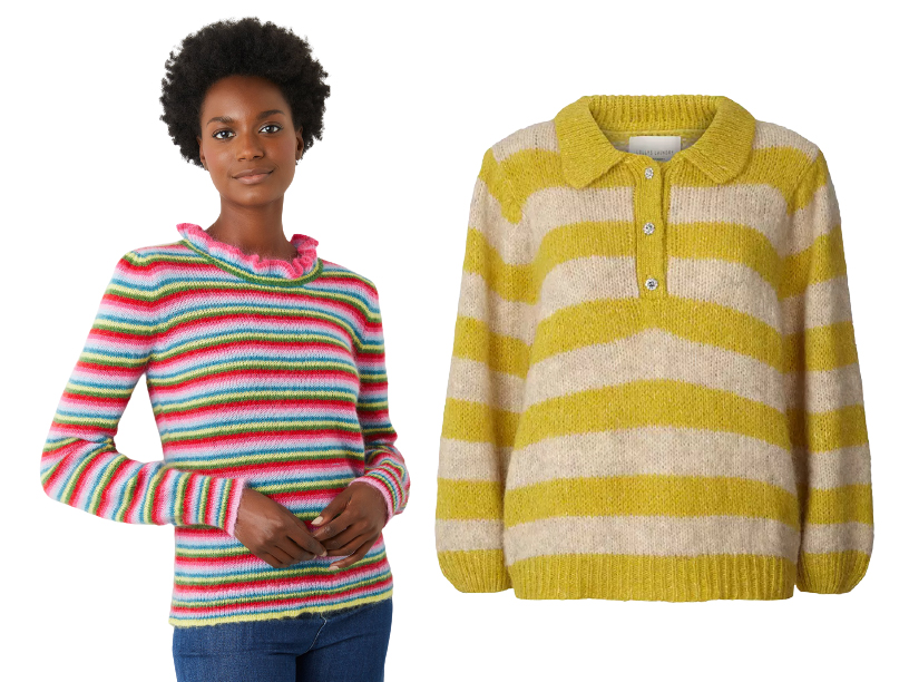 Left: Frill collar striped jumper, £175, Wyse London; Right: Yellow collared striped jumper, £111, Lolly’s Laundry at John Lewis