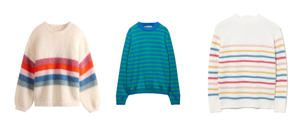 Left: Balloon sleeve rainbow striped jumper, £125, Hush; Middle: Green and blue stripe jumper, £29.99, Zara; Right: Cream striped jumper, £16, Matalan
