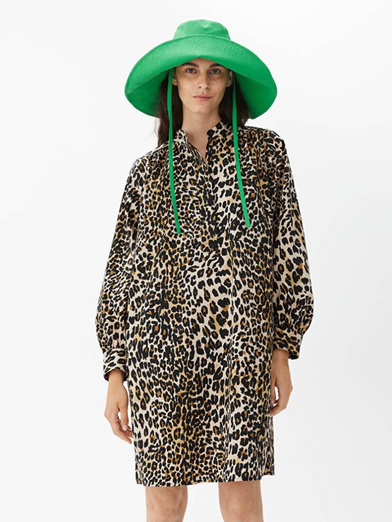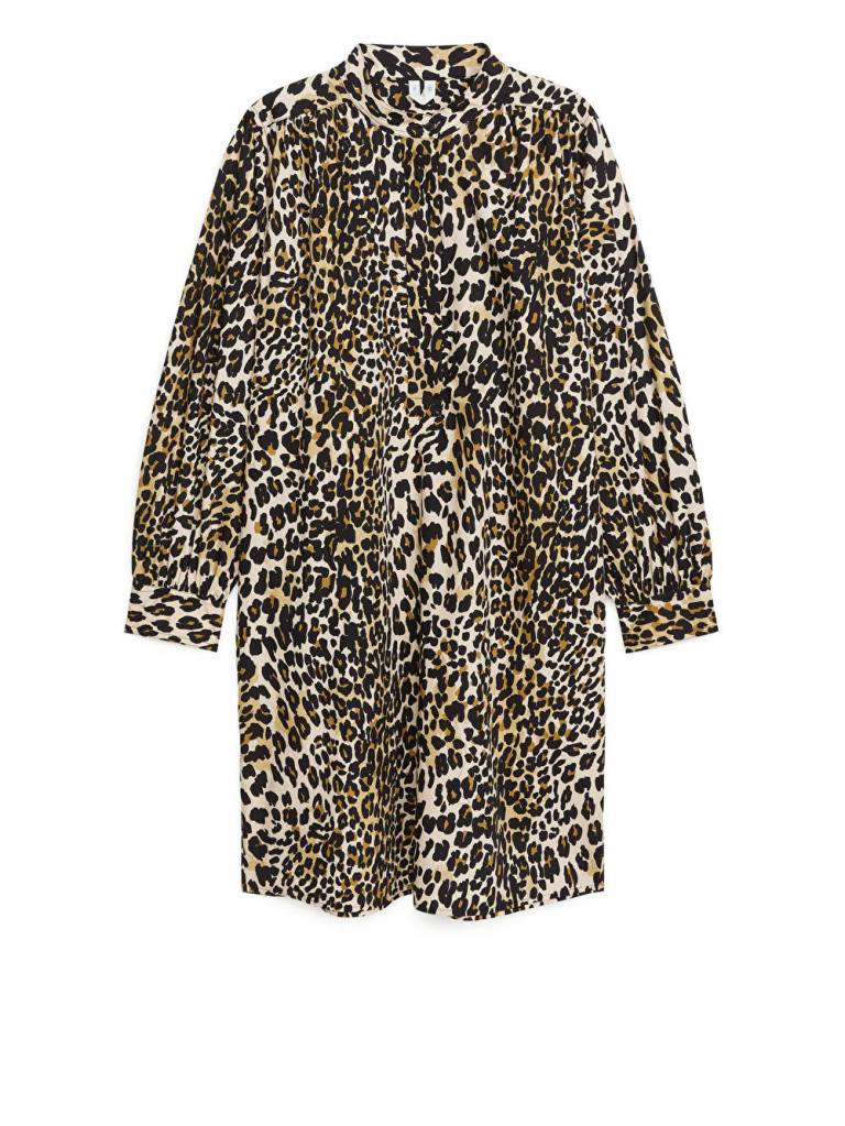 The pop-over shirt dress is for those of us who simply do not have the time, nor the inclination to do all the buttons on a shirt dress in the morning. This easy throw on piece features a front panel of buttons, but is kind of like the shift version of a shirt dress. In classic animal print leopard, this look really won’t date and made from organic cotton, you can wear this right through the year. Pair with opaque tights and a chunky knit cardigan for cold winter days.