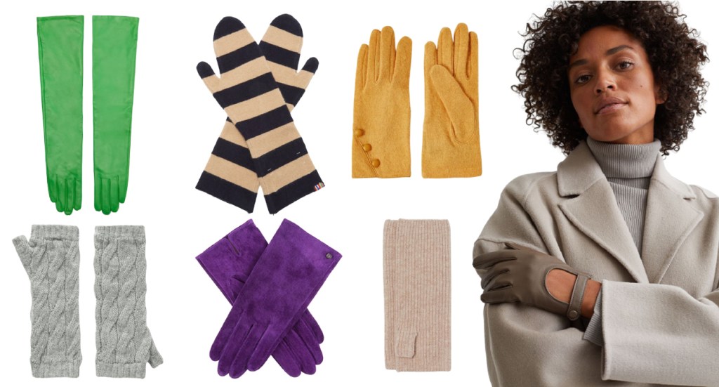 Top row, left to right: Elbow-length green leather, £49.99, Zara; Striped cashmere mittens, £108, Extreme Cashmere at Matches Fashion; Yellow button detail gloves, £14, Accessorize