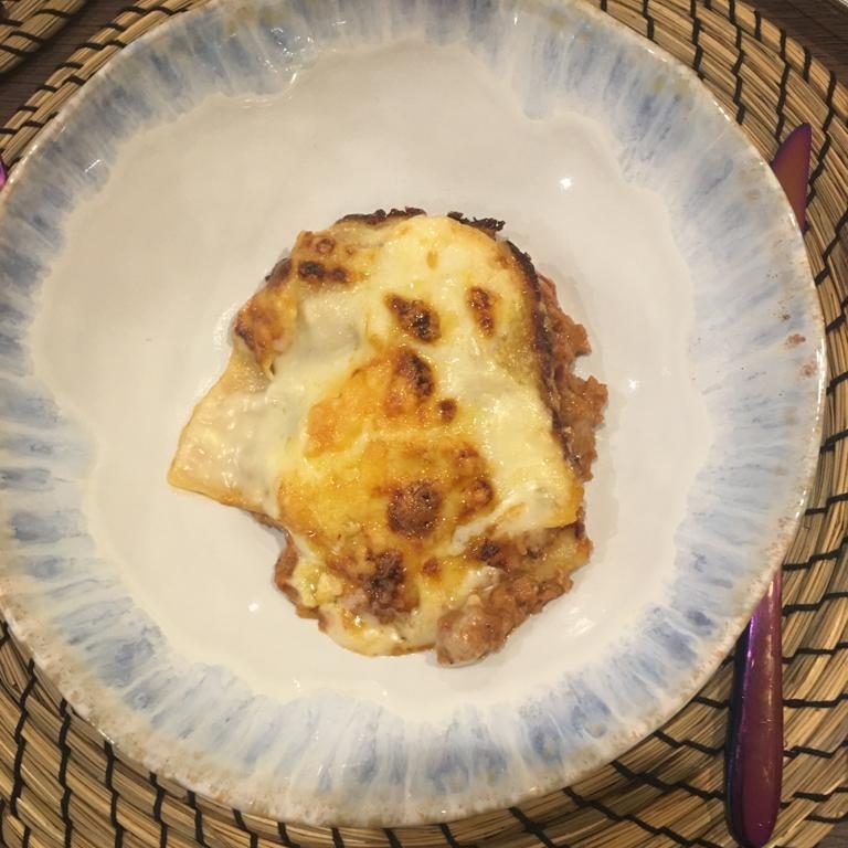 In a large baking dish layer mince, pasta, bechamel, then repeat again mince, pasta, bechamel etc until you have created the desired number of layers (two – three is enough)