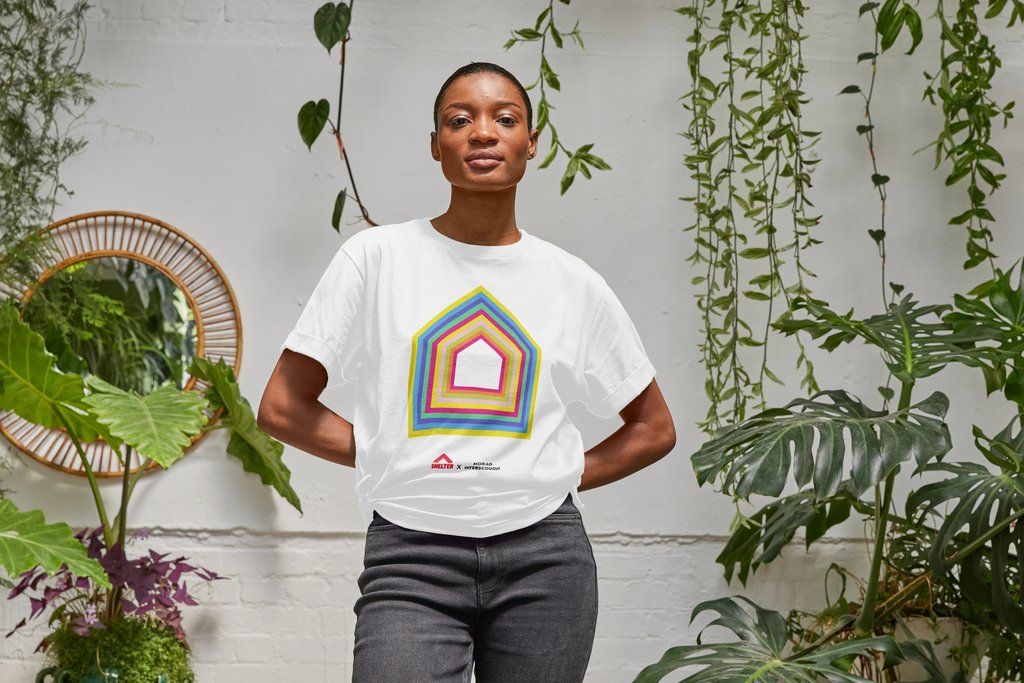 Four leading artists and designers were asked by Shelter to create a design to reflect why a home is a basic fundamental need and a basic moral right. Pictured is Morag Myerscough’s t-shirt – the others are Bespoke Binny, Rob Ryan and Mawuena Kattah. £20, shop.shelter.org.uk