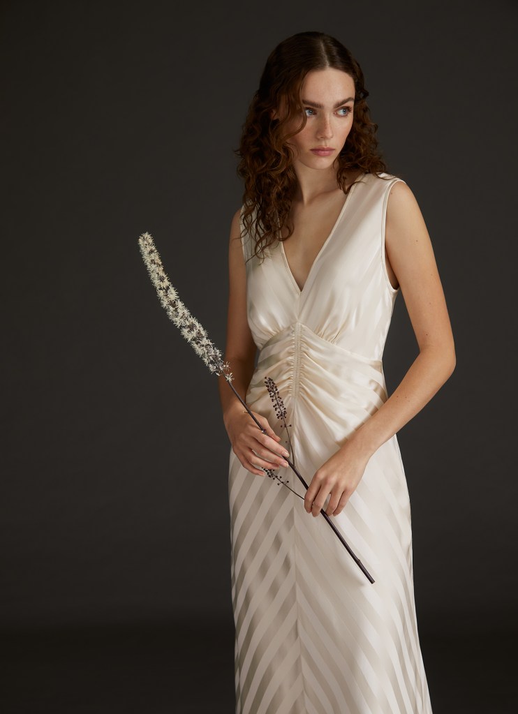 Our favourite? The stunning cream silk Colette gown, which features a gathered front and self-stripe pattern on a diagonal, priced at £1,299.