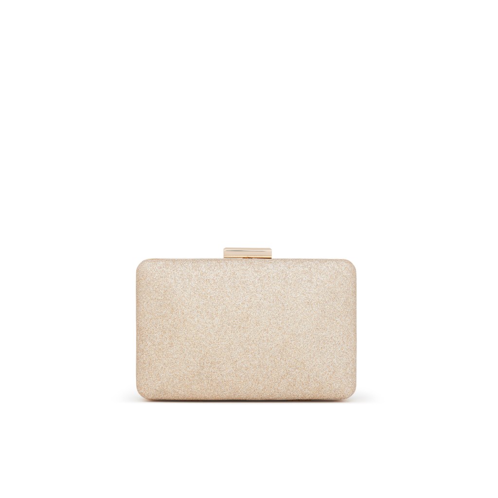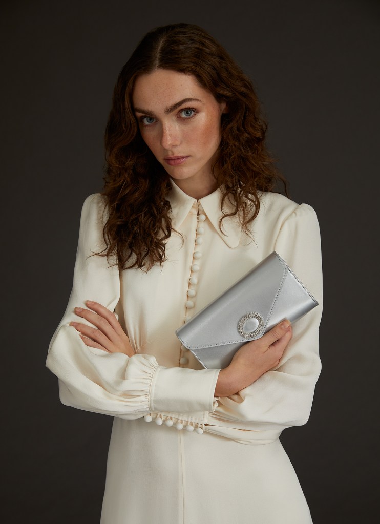 Left to right: Dotty champagne clutch, £150; Dotty ivory clutch, £150; Lucy gold clutch, £125
