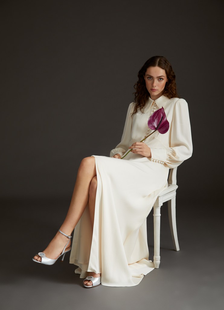 Meanwhile, the ivory Harlow dress features an on-trend statement collar, delicately puffed full sleeves, as well as a fitted silhouette finished with covered buttons giving it a designer bridal feel but with a price tag of only £999.