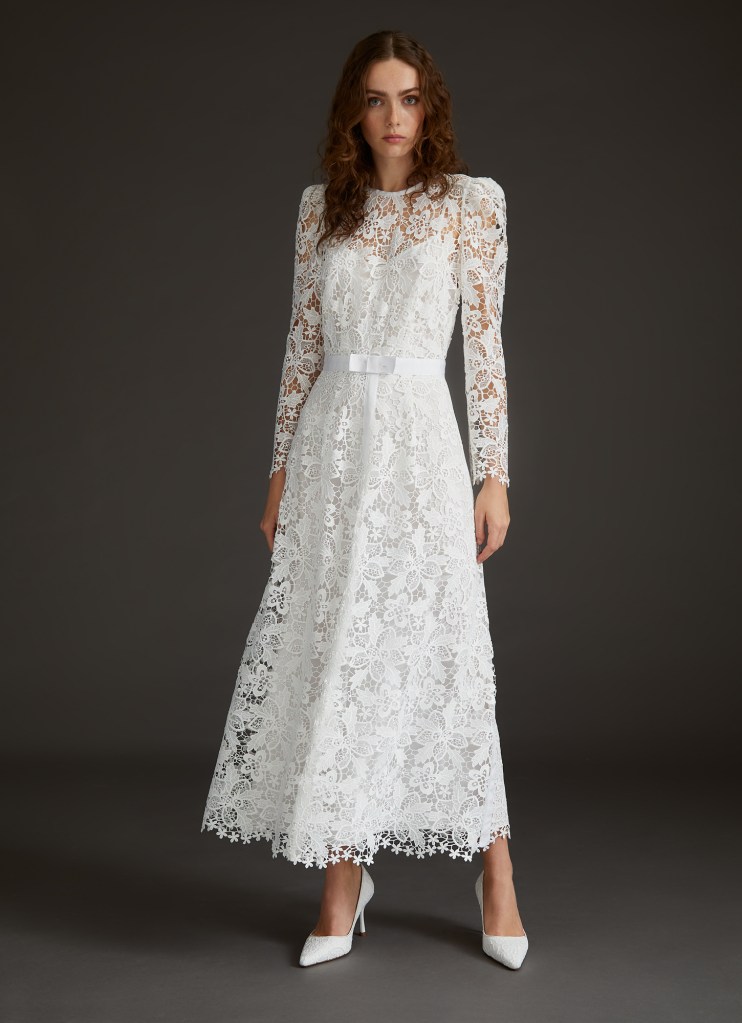If you’re a lace lover, check out the gorgeous off-white Lila dress, £799, which has a gathered waist and modern above-the-ankle hemline, perfect for showing off your wedding shoes.